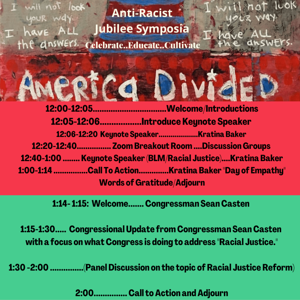 The Antiracist_Jubilee_ Symposia (Celebrate..Educate..Cultivate) is pleased to have hosted the event,“Race In America,”on Sunday, February 21, 2021. Our keynote guests were Kratina Baker, and Congressman Sean Casten.