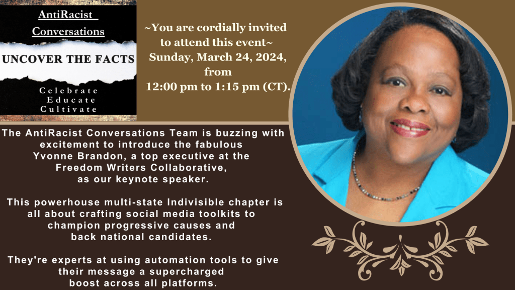 During National Women’s History Month in 2024, centered on “Women Who Advocate for Equity, Diversity, and Inclusion,” the AntiRacist.Conversations Team is honored to recognize the women within our team and our keynote speaker for the month, Yvonne Brandon.